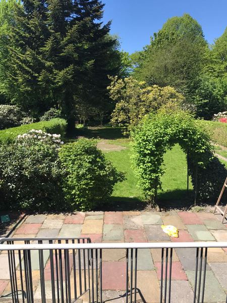 Der Blick geht über den 550qm großen Garten hinaus direkt ins toll eingewachsene Brommygrün. Der Garten gehört ebenfalls zur Wohnung und kann frei genutzt werden.