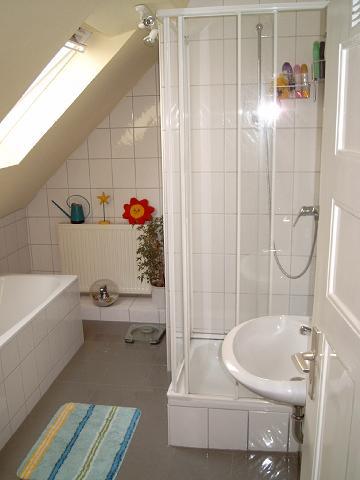 Vollbad mit Fenster und kleinen Abstellräumen, Schlafzimmer, 2. Zimmer, Zugang zum Dachboden